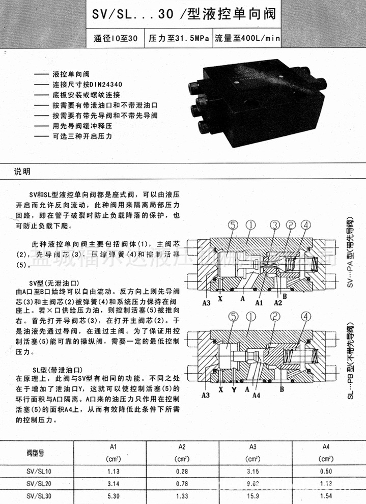 SV/SL型液控单向阀SV型为泄漏油内部回油;SL为泄漏油外部回油。SV/SL型液控单向阀只允许油液从正向通过,反向则截止,可用作保压。当接通控制油口X时,压力油可反向流动。