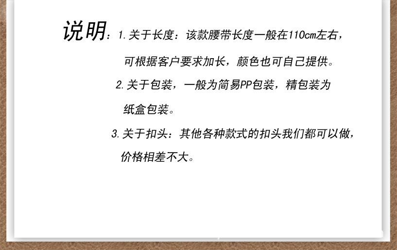 天德公司位于被誉为“华夏第一市”的中国小商品城-浙江义乌。我公司是一家集生产、销售为一体的现代化工贸型企业,专业生产销售男士、女士、儿童类,真皮皮带,PU/仿皮皮带,编织腰带,帆布腰带,松紧腰带,五金腰带等各种时尚腰带,款式新颖,质量上乘,价格低廉,能满足各类人士需求,接受来图来样订货。热忱欢迎国内外客户来我司洽谈合作相关事宜。