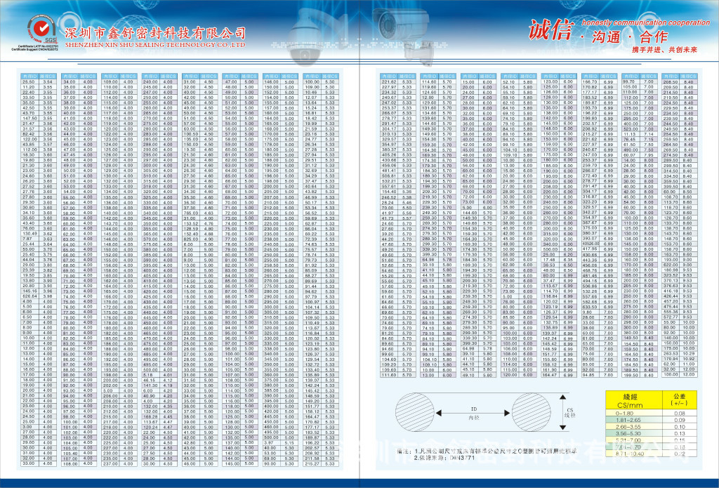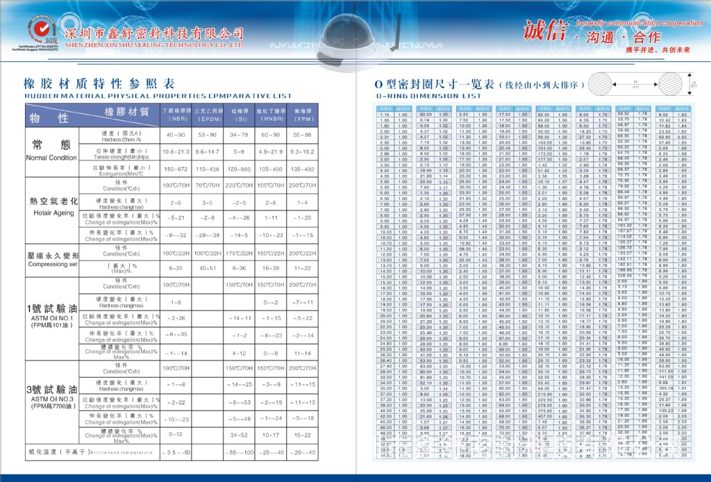 深圳市鑫舒密封科技有限公司 本公司專業生產防水、防油、耐高、低溫密封圈、O型環及各種橡膠、硅胶墊片,集研發、生產、銷售為一體。公司自2000年成立以來,先後通過了IS09002、QS09000、TS16949認證,其產品廣泛用於汽車、摩托車、工程機械、農業機械、卫浴、電子、鐵路、化工、製冷等相關行業。產品遠銷世界各地,目前正致力於國內市場的開發。本公司的原料全部源自歐、美、日、進口的橡膠原料,並採用高效率的進口生產設備和專業技術人才,可根據客戶提供的圖樣,生產出各種標準或非標準的橡膠產品。公司本著“質量第一、客戶至上”的生產理念,尋求與客戶共發展的經營之道。希望有機會與貴公司攜手合作,共創輝煌!歡迎來電諮詢!