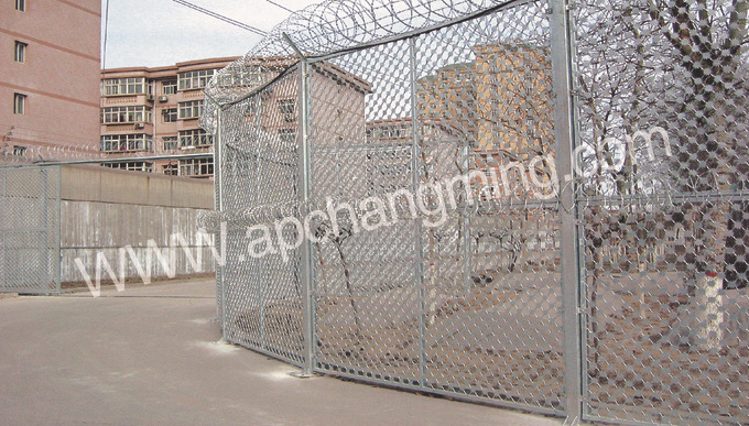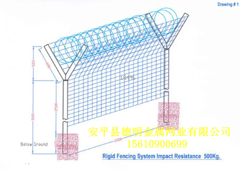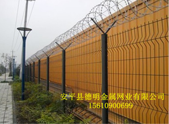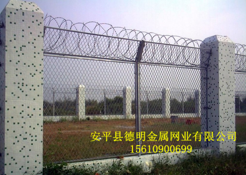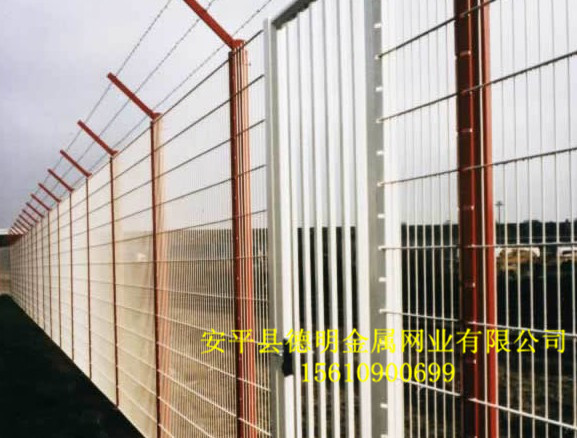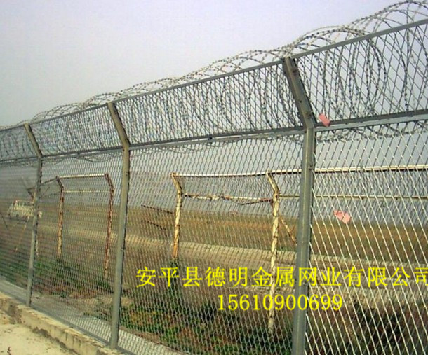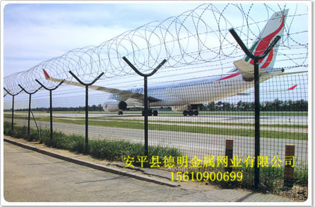 机场护栏网又称作“Y型安全防御护网”,是由V型支架立柱加强型焊接片网,安全防盗连接件和热镀锌刀片刺网组成强度和安全防御性级别很高。被广泛应用在机场,军事基地等高安全场所。
