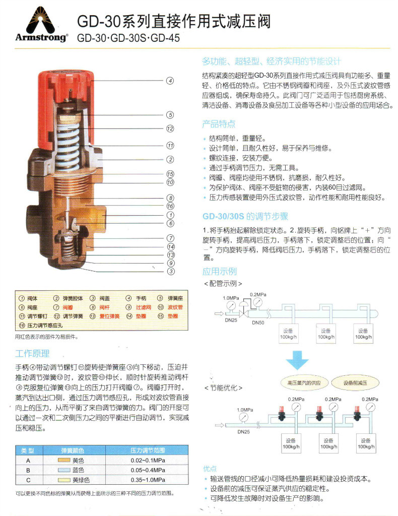 GD-30是一种体积小巧、高性能的直接作用式减压阀。由于购买和使用成本不高,它非常适合于精确度为+/- 10%的低流量至中流量流体的减压调节。GD-30型减压阀非常适用于洗衣店、干洗设备、医院设备、轮胎模具、加湿器、小型加热器和食品加工等各个领域。它应用于蒸汽系统终端工况时可提供紧密闭合。