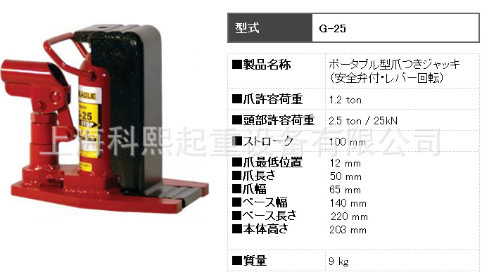 科熙起重代理销售日本鹰牌千斤顶,其中鹰牌爪式千斤顶最大的特点就是可以横向使用,满足某些特殊场合作业的需要,但不是所以的型号都可以横向使用,可横向使用的鹰牌爪式千斤顶竖直使用时和一般千斤顶没什么不同,但在有坡度是就可以显现出来此类千斤顶的优点了。其中可横向使用的型号有鹰牌G-40标准型爪式千斤顶、鹰牌G-60标准型爪式千斤顶、鹰牌G-100标准型爪式千斤顶、鹰牌G-60T低矮型爪式千斤顶、鹰牌G-100T低矮型爪式千斤顶、鹰牌G-60TL低矮加长型爪式千斤顶、鹰牌GW-60二段爪式千斤顶等。