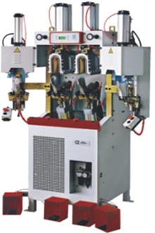 机器说明: ◆ALFA75 主要设计用于粘合鞋帮、鞋后踵及鞋连接线,同时使这三部分以正确的方式定型。 ◆从机器前面看过去,可以看到一个由两个铝模(冷模)和两个橡胶模垫(用于成型鞋面)组成的中心站;在中心站的两边各有一个铝模和一个橡胶模(热模),它们都是由温控系统进行加热的。这些都是用于使热熔胶与鞋面后 踵更加贴合的。 ◆在机器的中心部位有一个控制面板,该面板上装有一些开关,它们分别是:黑色按钮用来启 动机器工作周期;红色按钮用于急停机器;主开关ON/OFF、显示灯与冷冻系统开关。 ◆在机器顶部中心部位是一个带显示屏的可编程控制器,在这里可以看到机器的工作状态和每站的工作温度。 ◆每站都装有夹爪,用于拉伸鞋面。比如:垂直方向是为了用于低跟的鞋面。调节角度可用于中跟的鞋面。两个可调节投影灯用于使鞋面贴楦效果更佳。 ◆该机器还装有 4 个气缸和各式的调节手轮用于设定模垫的位置。 ◆机器所有的电子元件包括:保险丝,电子卡,变压器等等,都装在机器前部控制面板盒里。 机器技术参数及规格 :