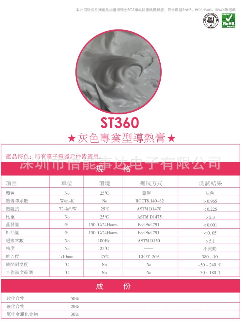 热传导系数:>1.172W/m-K热阻抗:<0.195工作温度范围:-30~180℃