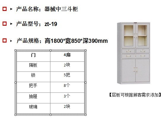 | ms器械中三斗柜 | 高1850*宽850*深390mm | 磨砂静电喷塑 | 0.7mm |