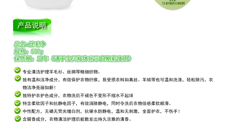 绿伞 丝毛净 500g 用于高档丝织品及羊绒材质衣物清洁 养护纤维