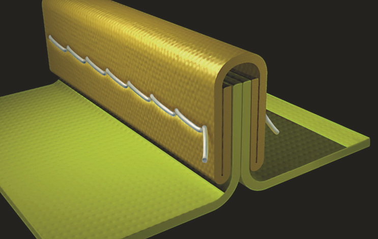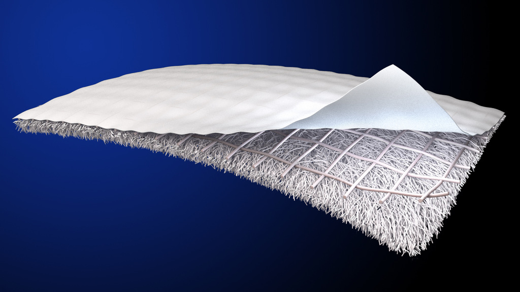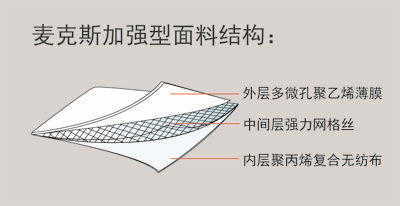 n在表层多微孔膜与底层无纺布面料间加入了强力网格丝,大大提高了面料的物理性能。