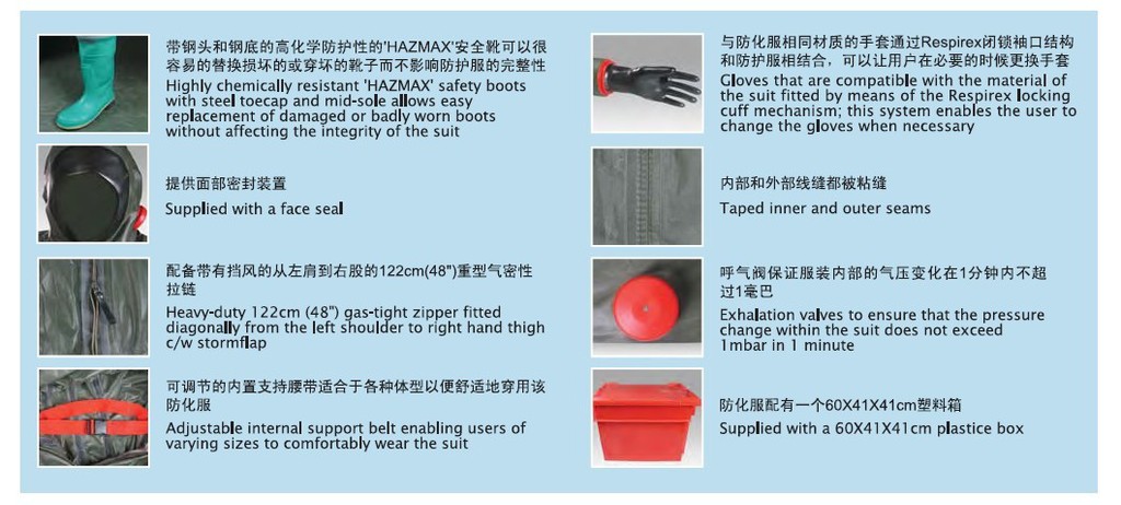 用于在狭隘空间中工作的可重复使用的1b"气密"危险化学防护服,丁基橡胶材质。适用于任何制造商的呼吸器(SCBA).配有防化手套和连体重型安全靴。呼吸器穿用在防化服外面。每件防护服都按照EN464:1994进行气密测试(内压实验)