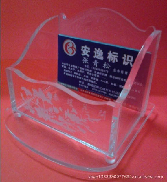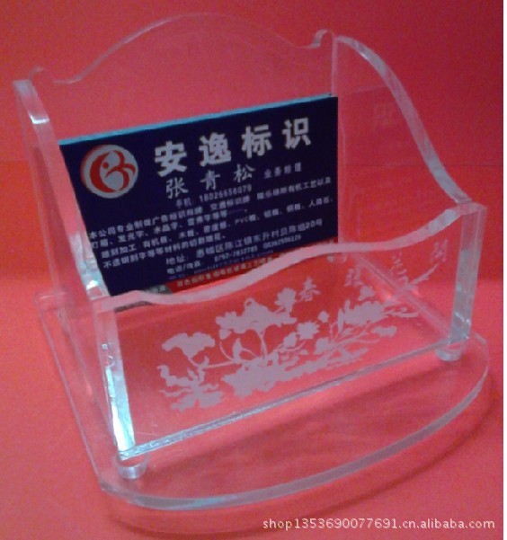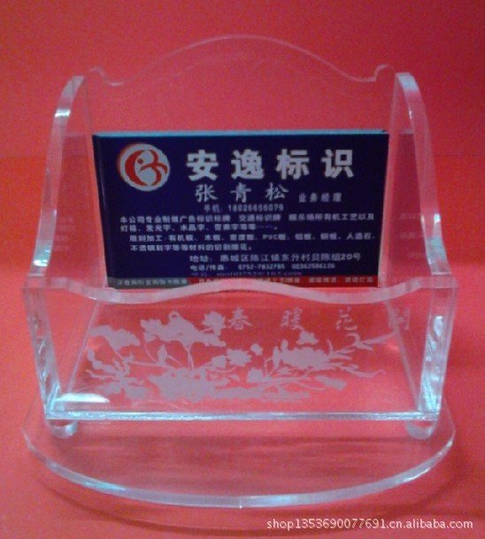 本公司主要生产亚克力工艺品,电子产品展示架,化妆品架,手机架,纸巾盒,名片盒,鞋架,柜台架,书架,超市系列展示架,日用工艺品,职责牌,铭牌,胸牌,广告标识交通牌,交通标识牌,授权牌,台卡,指示牌,工作平牌,奖牌,灯箱,发光字,水晶字,雪弗字,浮雕通花板,玻璃工艺,克力是一种有机玻璃,具有良好的透明性,化学性,稳定性,可以订做.等等