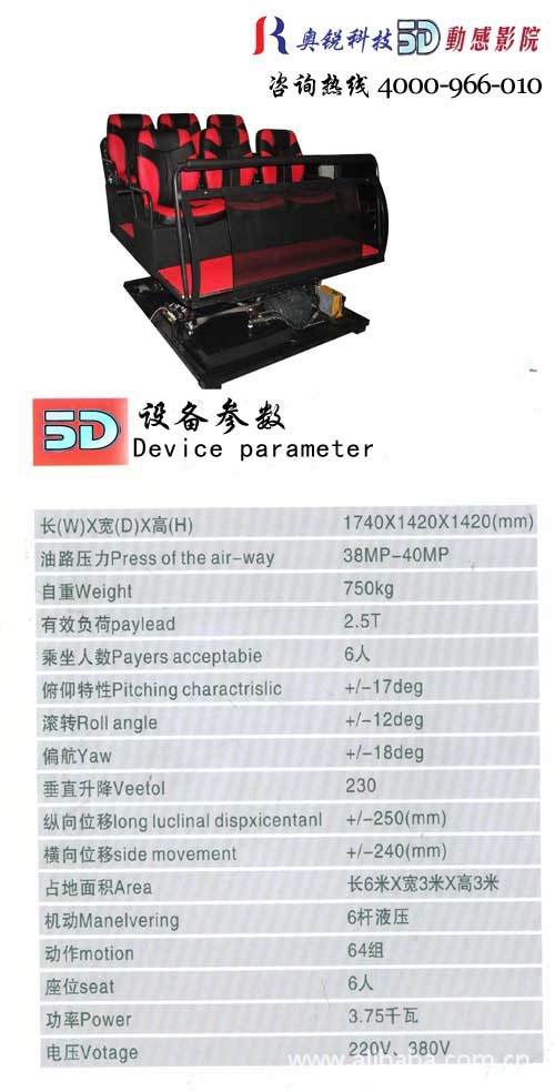项目背景:“新动力奥锐5D动感影院”就是在这个背景下提出的,由于中国5D动感电影刚刚起步,现有设备的动感模拟水平较低,很多同行简单的3自由度运动平台,动作生硬,缺乏真实感,没有娱乐价值,更不能形成规模化商业运做。“新动力奥锐5D动感影院”将视觉效果提升为4维立体影片,将动感模拟技术提升为国际先进的六自由度电动液压平台,随着电影的情节做出相应动作,再配合闪电模拟/下雨模拟/降雪模拟/烟雾模拟/泡泡模拟/降热水滴/振动/喷雾模拟/喷气/喷雾/扫腿/耳风/耳音/刮风等多种特效,几分钟的特效影片营造出如:超级过山车、火山爆发、银河战争、极地探险等惊心动魄的梦幻世界,为我们打开一扇身临其境的极致体验之门。
