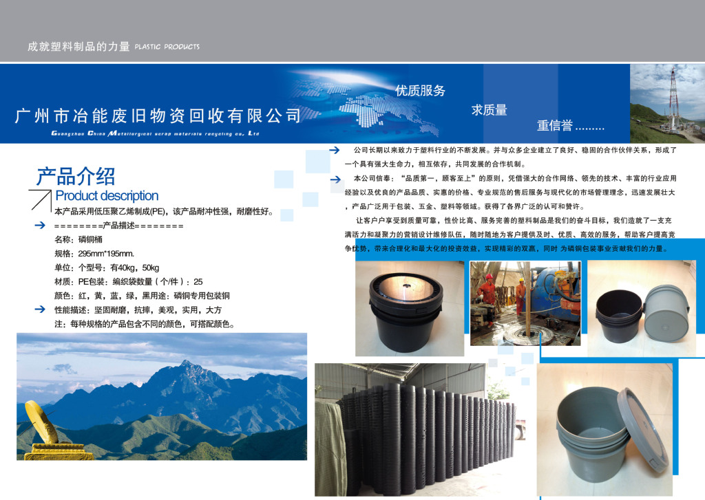 广州市冶能废旧物资回收有限公司是专业生产通信线破碎乙料、磷铜球/角专业外包装桶、塑料桶制品等产品专业厂家,严格按先进工艺组织生产。以优良的产品、优质的服务、合理的价格产品销售于浙江、上海、福建、江西等多个地区。诚信的保证赢取客户,深受广大用户的欢迎和信赖。 冶能以开发新型的高技术、高科技的塑料产品为奋斗目标,真诚欢迎各企业单位、外商及个人到本厂惠顾、洽谈。本着互惠互利、长期合作的原则,我们以热情态度、优质服务的企业精神为客户服务,于客户携手迈进美好辉煌的明天。