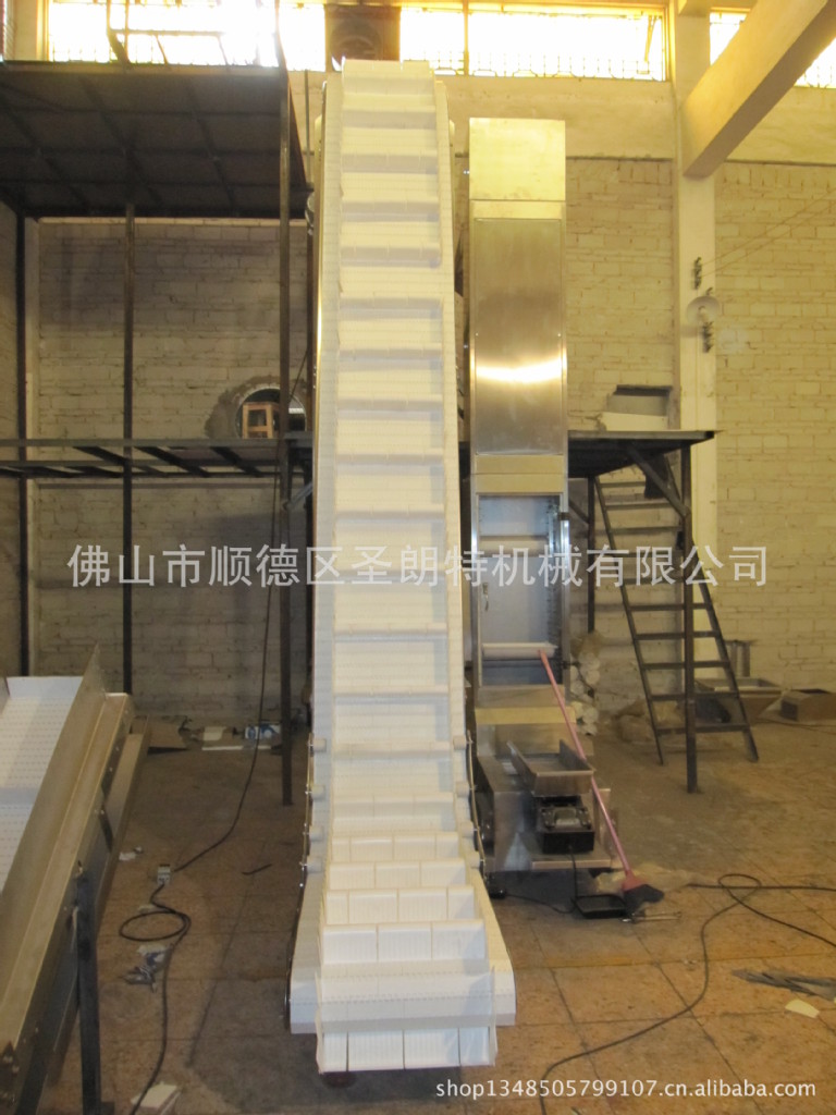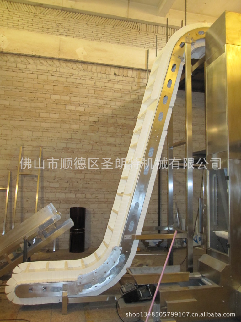 1.输送带由食品级塑料聚丙烯(PP)注塑而成,并且采用链轮带动链板传动的原理,与传统输送带的磨擦传动相比具有耐用、抗氧化、不磨损、承载量大等优点。刮板和两边挡板设计,可以起到提升物料和阻挡物料两边的侧漏作用。