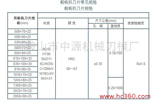 中源机械有限公司专业生产销售各种型号的剪板机刀片(刀具),全钢/镶钢剪板机刀片(刀具),Q11、QC12Y系列剪板机刀片,QC12K剪板机刀片,以及配套各种数控剪板机上的剪板机刀片,刀片主要采用T10、9CrSi、SKD11、6CrW2Si、Cr12MoV、H13K、HMB、W18Cr4V等优质合金工具钢制造。产品种类多、规格全。部分产品现货供应,非标产品可根据客户提供的产品图纸、规格及刀片材料、HRC值等要求加工定做。公司交货时间及时,产品质量均实行三包(包修、包换、包退)。欢迎广大新老客户及产品配套企业与我们联系,洽谈订购。