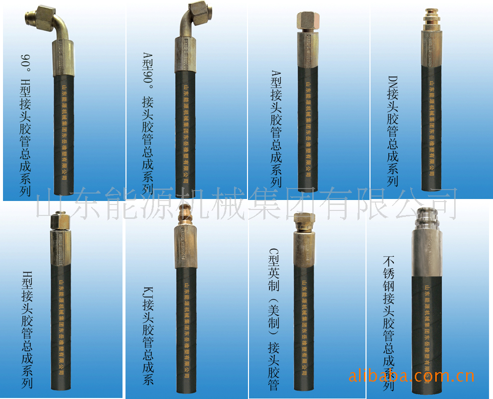 产品结构:胶管主要由耐液体的合成橡胶内胶层、中胶层、Ⅰ、Ⅱ、Ⅲ层钢丝编织层或Ⅱ、Ⅳ、Ⅵ层钢丝缠绕层、耐天候的合成橡胶外胶层组成,内胶层具有使输送介质承受压力,保护钢丝不受侵蚀的作用,外胶层保护钢丝不受损伤,钢丝层是骨架材料,起增强作用;两端扣压各种型号胶管接头组成胶管总成,两端接头主要用于与使用设备的连接。