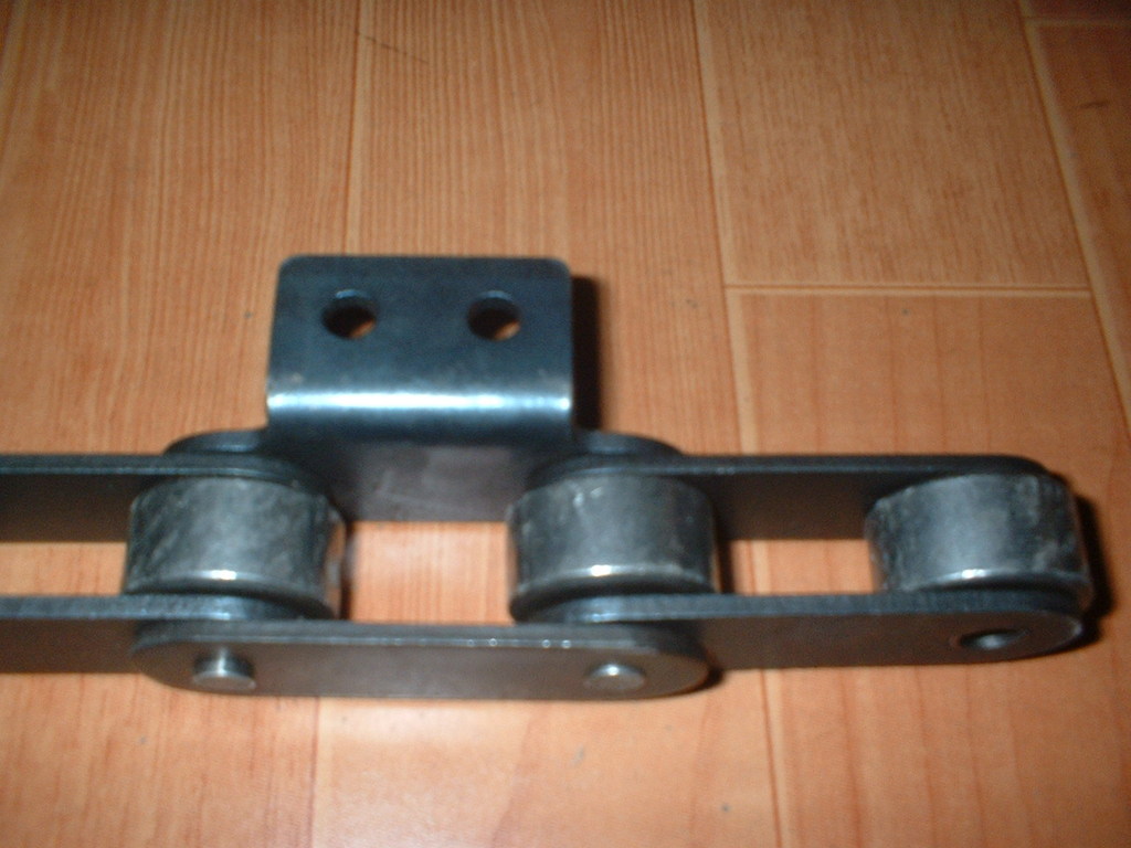 双节距链条有大滚子、小滚子之分;链板厚度有常规、加厚2种;附件(弯板)有4种形式:单侧单孔(A1型)、单侧双孔(A2型)、双侧单孔(K1型)、双侧双孔(K2型)。具体型号如下: