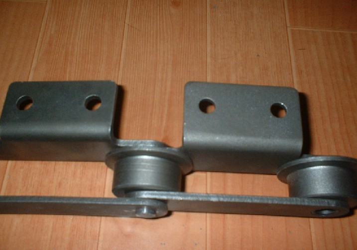 链条滚子有小滚子(S型)、大滚子(P型)、凸边滚子(F型)、空心销轴结构、轴承滚子。链条附件形式有:单侧弯板、双侧弯板、侧滚轮/尼龙滚轮、加长销等。