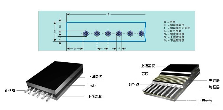 环形钢丝绳芯输送带也称钢丝绳芯输送带,皮带是由芯胶、钢丝绳、笼盖层和边胶构成。拉伸强度大,抗冲击好,寿命长,使用伸长小,成槽性好,耐曲挠性好适于长距离,大运程,高速度输送物料。该产品抗张强度较普通输送带高,长度也较长,可以减少转换点,节约动力和治理用度。被广泛用于矿山、煤场、化工、冶金、建筑、港口等部门输送物料。钢丝绳皮带的品种按结构分为普通型和抗冲击、抗撕裂型。按覆盖胶性能可分为:普通型钢丝绳芯输送带。阻燃型钢丝绳芯输送带,耐热型钢丝绳芯输送带,耐磨型钢丝绳芯输送带,耐寒型钢丝绳芯输送带,耐酸碱型钢丝绳芯输送带,耐油型钢丝绳芯输送带,阻燃型钢丝绳芯输送带等。