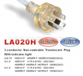 SAA认证澳大利亚三芯透明插头电源线 10A/250V