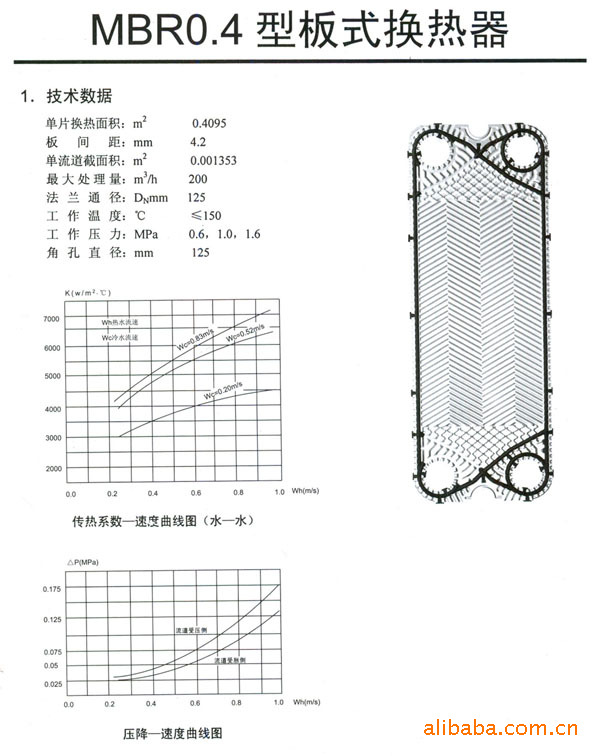 MBR0.4型板式换热器具有换热效率高,物料流阻损失小,结构紧凑,温度控制灵敏,操作弹性大,装拆方便,使用寿命长等特点。是目前国内最先进的高效节能换热产品。可处理物料非常广泛,从普通的工业用水,到高粘度液体,从卫生要求较高的食品液体、医药物料到具有一定腐蚀性的酸碱液体,从含小颗粒粉体的液态物料到含少量纤维的悬浮液体等均可处理。可用于加热、冷却、蒸发、冷凝、杀菌、消毒、热力回收等场合。目前已广泛应用于冶金。矿山、石油、化工、电力、医药、食品、化纤、轻纺、造纸、船舶和集中供热等工业部门。