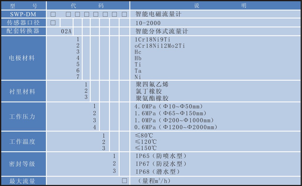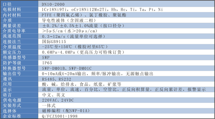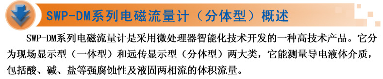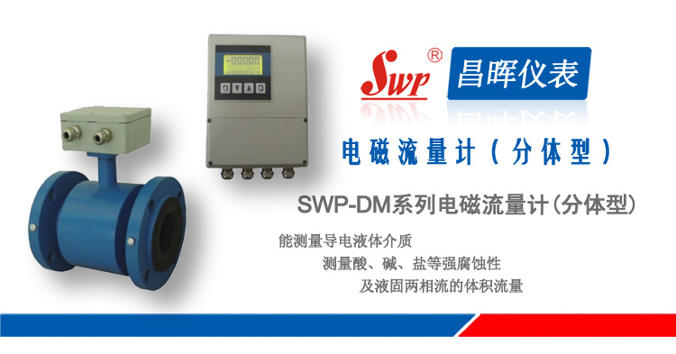 SWP-DM系列电磁流量计是采用微处理器智能化技术开发的一种高技术产品。它分为现场显示型(一体型)和远传显示型(分体型)两大类,它能测量导电液体介质,包括酸、碱、盐等强腐蚀性及液固两相流的体积流量。