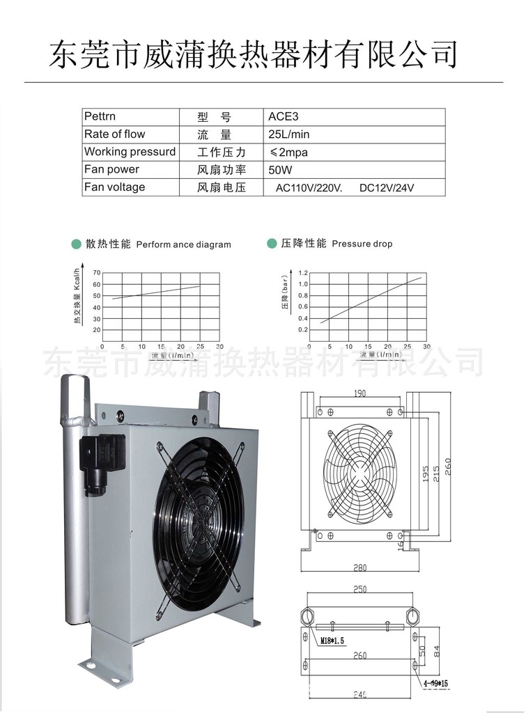 AF/AH/ACE/D系列铝合金风冷却器特别选用重量轻、抗震强度佳、热交换效率高的铝合金材料制成。在结构上,散热管内另有内置翅片,以增大散热面积,加快热传导度,在风扇之作用下,以空气为冷却源,将热量强制带走,从而获得低成本、高效率之冷却效果,为市上最佳之散热器。本系列产品适用范围:油压系统、润滑系统、传动油系统、船泊油压系统、车辆油压系统、电力系统等。更大马力要求,欢迎订制