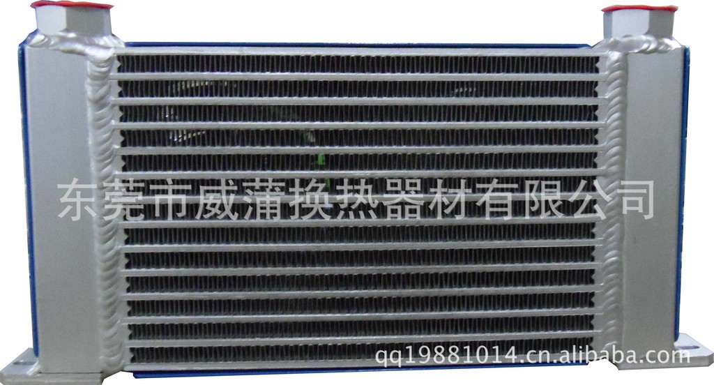 当前国内外应用日益广泛的的风冷却器,是采用导热性能佳的铝合金为材料,流体通道和风通道为先进的板翅式结构,芯体采用真空钎焊而成,其流体通道设置内翅片。与传统的铜管式相比,单位体积热交换面积大为提高,是传统铜管式结构的10-20倍,换热效率尤佳。常用作液压传动系统的辅件,对液压油进行冷却,以获得液压油正常的工作温度(范围),提高液压系统工作的稳定性和零部件的使用寿命