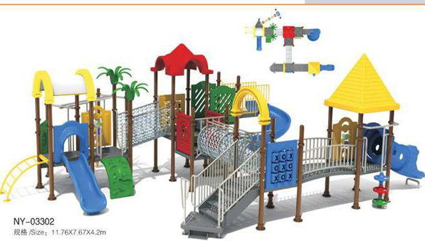 大中型组合乐园: 使用方法及功能:大中型游戏架是为3-12岁儿童而设计的组合游戏乐园.使用时儿童应由走梯或爬杆而上,由滑梯上面滑下,和爬杆上爬下,且由成人监护下使用,游戏中可以通过玩铁索桥、爬钻洞、数字游戏、齿轮游戏、荡晃桩、照镜子、波浪滑梯、旋转滑梯等游戏活动、从而达到锻炼儿童意志,提高儿童的反应能力以及群体能力;在游戏中锻炼;在游戏中成长、禁止儿童在滑梯由下而上冲跑;禁止儿童在铁桥扶手、栏门及直园筒上爬行和做其他危险的游戏动