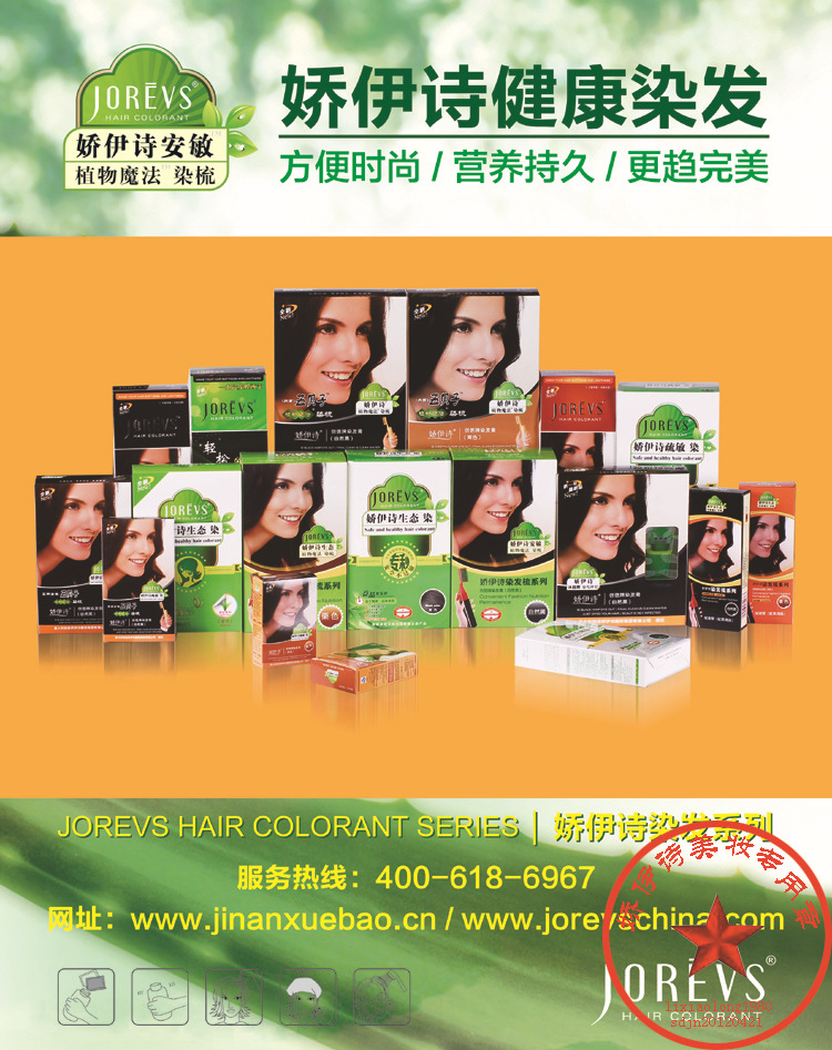 绿色环保,行业首家获ISO14001论证、ISO9001论证。品质纯正温和,能使染后秀发由内而外散发出亮丽动人的自然风采,风行整个亚洲大陆. 1.创新植物染发科技,能染出一系列纯净、饱和、闪亮的颜色,并恒久保持。 2.富含天然植物营养精华,即使是脆弱发质,要多次染发后也能彻底保护秀发免受伤害。特点1:本产品含天然植物元素,对身体无危害,无毒、无刺激、不过敏;既保持了草本精华的原有鲜活成份,能为彩染后褪色的头发作同色修补,又能在发丝上形成强有力的保护膜,对受损发质有良好的修护作用,使头发更自然、更强壮、更富有光泽。 特点2:本染发剂着色力强,着色自然,不褪色,不变色,不粘皮肤,染色效果持久;不含阿摩尼亚,不需要双氧水,安全可靠。特点3:本染发剂的美发成分能深层滋润头部皮肤的毛乳头,改善毛球部毛母细胞的色素营养,消除头发干枯、开叉、断裂的问题,同时可防脱发、去头屑、止痒以及抑制白发出现。特点4:染发剂富含多种天然植物活性因子,使用后改善发质,令秀发柔软亮泽、发丝具有韧性,可缓解头部压力,润养头部皮肤,起到保健作用。每盒包含: A剂100g 手套 B剂100g 五贝子植物染发梳1把