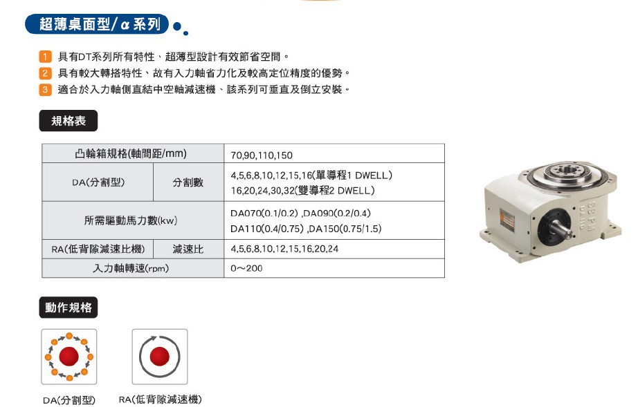我公司代理销售的正名凸轮分割器拥有型号为,超薄桌面型、法兰型、平行分度凸轮行、平台桌面型、升降法兰型、升降心轴型、心轴型、中空法兰型。