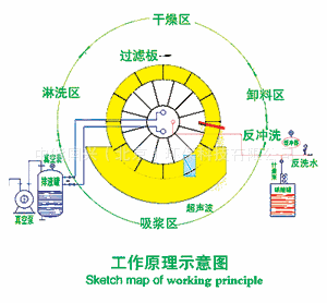吸浆区:工作时浸没在料浆的过滤板在毛细作用下结合真空压力,表面吸附成一层滤饼,滤液板进分配阀至排液罐;
