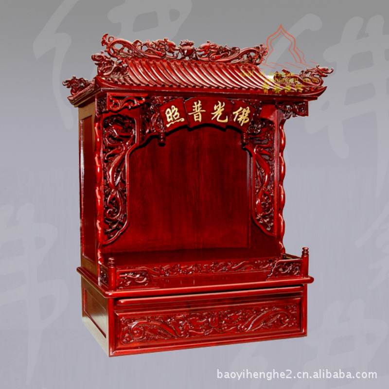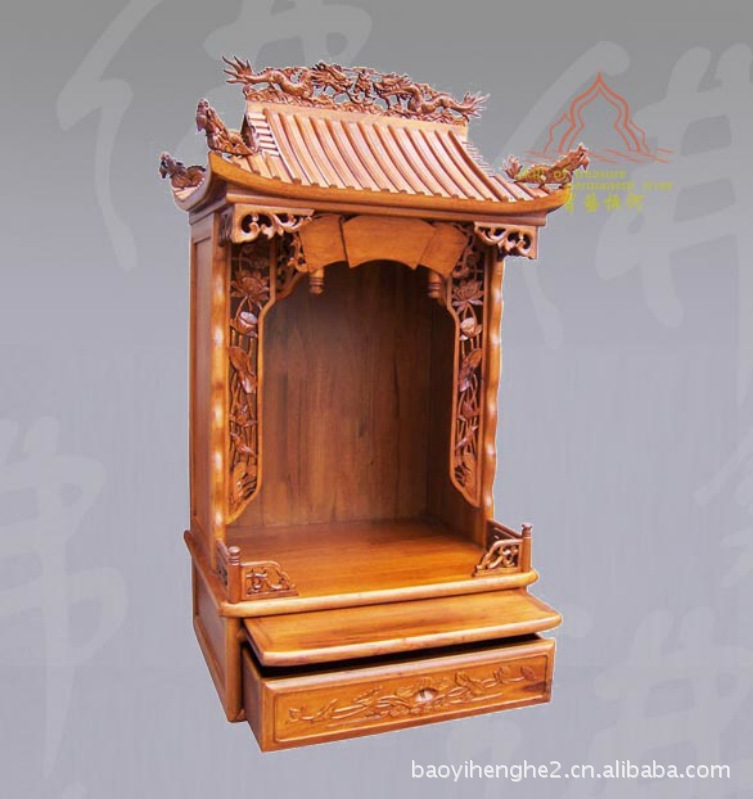 屋顶飞檐重叠翘立并雕刻瑞兽装饰,严格依据建筑比例微缩而制,上半部分盘龙浮雕柱、镂空透雕荷花纹、风水葫芦雕纹使用,内部可拆式素面、侧草花浮雕底座;中间伸缩式平面抽板;下柜抽屉、门面板配有精美草龙纹、荷花浮雕,直条素面边框。整体蕴含佛家祥和肃穆之气。