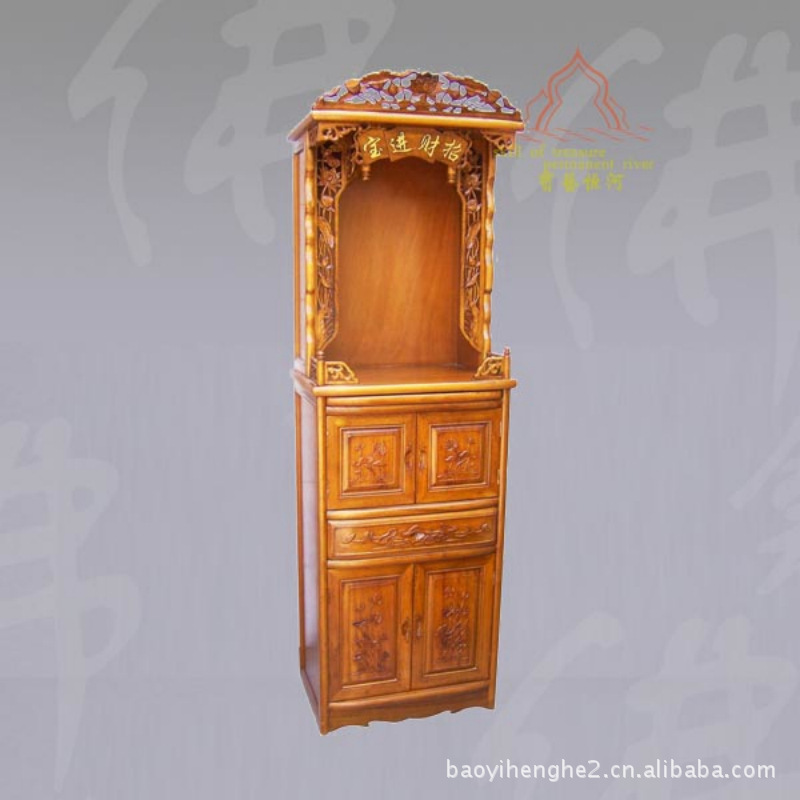 屋顶飞檐重叠翘立并雕刻瑞兽装饰,严格依据建筑比例微缩而制,上半部分盘龙浮雕柱、镂空透雕荷花纹、风水葫芦雕纹使用,内部可拆式素面、侧草花浮雕底座;中间伸缩式平面抽板;下柜抽屉、门面板配有精美草龙纹、荷花浮雕,直条素面边框。整体蕴含佛家祥和肃穆之气。