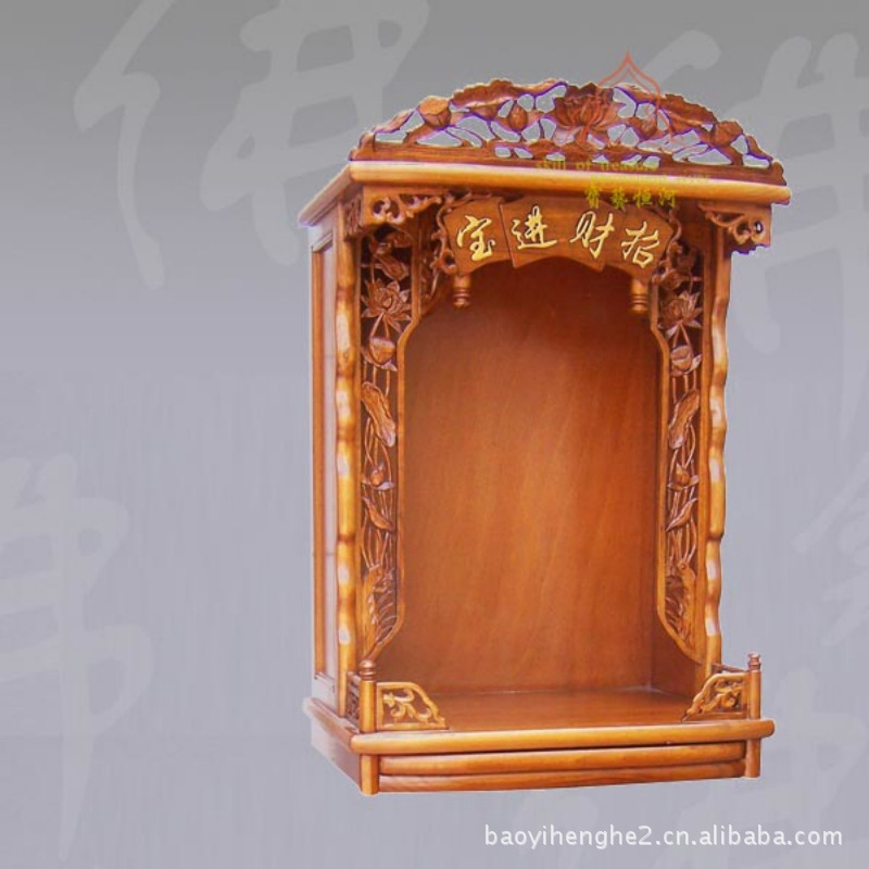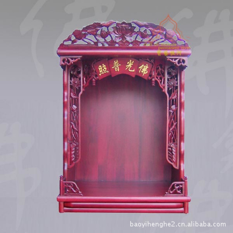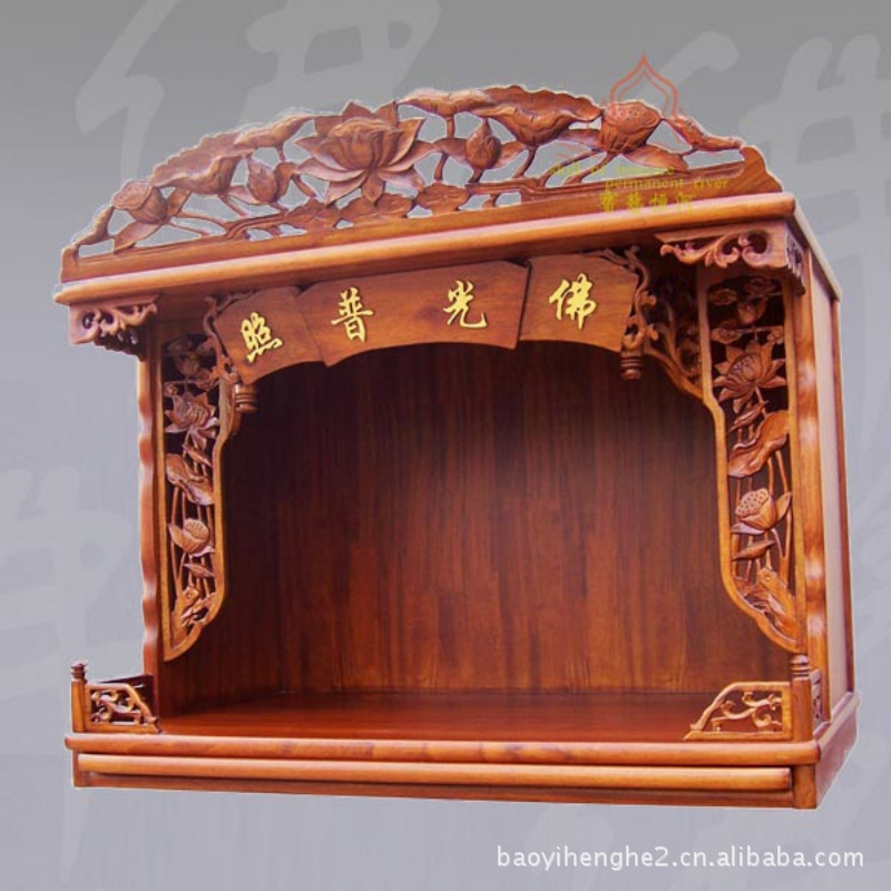 屋顶飞檐重叠翘立并雕刻瑞兽装饰,严格依据建筑比例微缩而制,上半部分盘龙浮雕柱、镂空透雕荷花纹、风水葫芦雕纹使用,内部可拆式素面、侧草花浮雕底座;中间伸缩式平面抽板;下柜抽屉、门面板配有精美草龙纹、荷花浮雕,直条素面边框。整体蕴含佛家祥和肃穆之气。