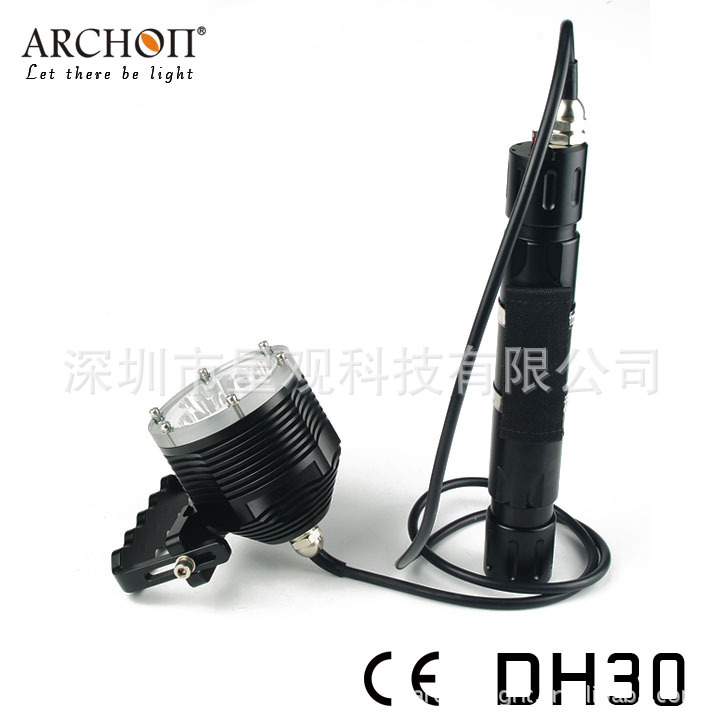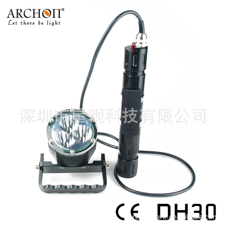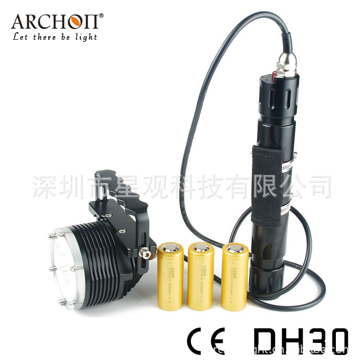 ARCHON DH30 LED Diving Light 是一款分体式潜水灯, 手握式潜水灯,采用3颗26650锂充电电池,超长使用待机.最高亮度高达3000流明,8度超强完美聚光,潜水时6500K的白光反映了周围环境的真实色彩。可选择三种模式输出,最大为100%或30%或应急信号闪亮,延长照明时间,减少近距离反射影响。灯体全铝合金设计高厚度硬质氧化处理,较强的耐用性和耐久性.其成为技术潜水及休闲潜水理想的潜水装备.