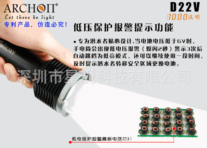 两项世界专利技术----(1)低电压报警系统,当电压低于6伏自动报警提示,爆闪3次警示2次转为低亮,此时还可以续航30分钟左右,提示潜水员及时转移安全区域或者更换电池,让潜水更安全!