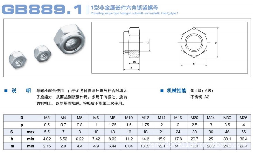 尼龙防松螺母又称非金属嵌件六角锁紧螺母。 六角锁紧螺母是一种有非金属物质(通常为尼龙)的颈圈嵌入的螺母。它的主要设计是增强逃脱扭力。
