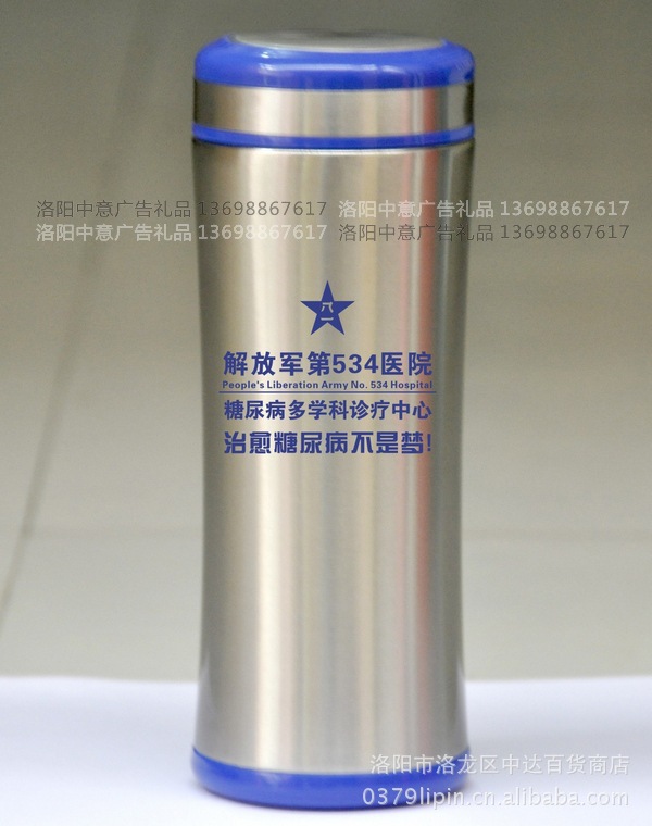 保温杯是由陶瓷或不锈钢加上真空层作成的盛水的容器,顶部有盖,密封严实,内外部均为不锈钢,用先进的抽真空技术精制而成,造型优雅、内胆无缝、密封性能良好,具有良好的保温性能。可放冰块,也可放热饮。与此同时,在保温杯的杯身印上公司的logo和宣传标语,使其更具内涵与实用性。
