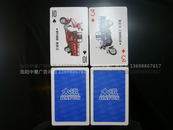 洛阳扑克牌、广告扑克牌、促销扑克牌、礼品扑克牌。洛阳中意礼品公司是河南地区专业的广告促销礼品定制公司,我们提供各种广告扑克牌、礼品扑克牌的定制服务。可根据需要定制企业专版扑克牌。广告扑克可印制企业名称、LOGO、产品图片等宣传信息,将企业的形象或产品通过扑克牌印刷出来,可以很好的展示企业产品,简介,服务等信息,从而提高公司的知名度和产品的销售。洛阳广告扑克纸牌可以促销礼品的方式送到消费者手中,让人们在打扑克的时候能看到公司的产品,也可以作为免费赠品送给客户,进行企业品牌推广。