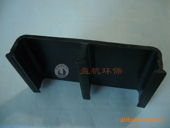 本产品为E型土工膜锚固件,为设有土工膜焊接的条状型材,条状型材的横截面呈E型,焊接位设置在E型横截面的背上