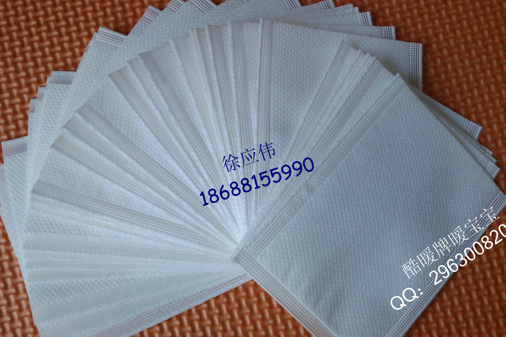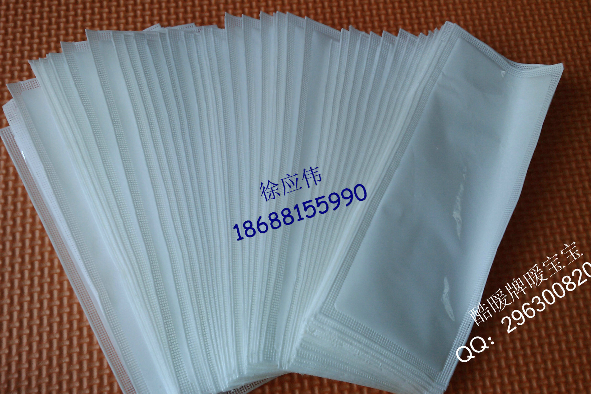 信阳市酷暖日用品有限公司 信阳市酷暖日用品有限公司 专业生产一次性输液加温器 药材内袋暖身贴 暖足贴 暖宝宝内袋。输液贴内袋暖宝宝透气膜 加温器透气材料。透气量控制稳定,保证暖宝宝温差在5度以内,是输液加温器 暖宝宝品牌加工或出口加工企业首选的功能材料,我们复合加工设备先进,工艺稳定,专业测试手段以客户至上,暖宝宝内袋 输液加温器内袋 足贴内袋 圆柱型加温器内袋等一次性三边封内袋 一贴热、发热贴等一次性发热产品的三边封内袋,大量提供大片圆角13x10cm和足贴U形9x7cm无纺布袋子,热 各种规格的暖宝宝内袋。用了我们生产的暖宝宝内袋,烦恼不再有,暖宝宝生产起来更轻松!