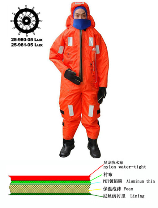 DBF-II 型救生服符合 SOLAS 公约、 INO 规范的要求,具有水密、浮力和自然保温功能,配有哨笛和救生衣灯,不需要加穿救生衣。它将衣裤连成一起,保护除脸部以外的整个身体,适用于各航区航行船舶、石油平台和其它海洋作业工程。该产品经中国船级社型式认可和检验。