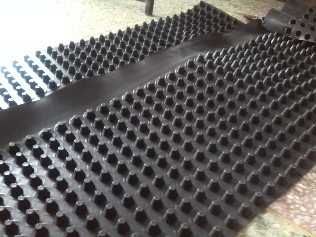 【卷材型排水板】施工:防水层、保温层做好后,打好混凝土,上面直接平铺上排水板凸点向上(有条件的排水板与排水板搭接的地方最好热熔处理),不做热熔处理的,顺着车库/屋顶找坡层,上面的压下