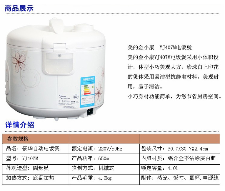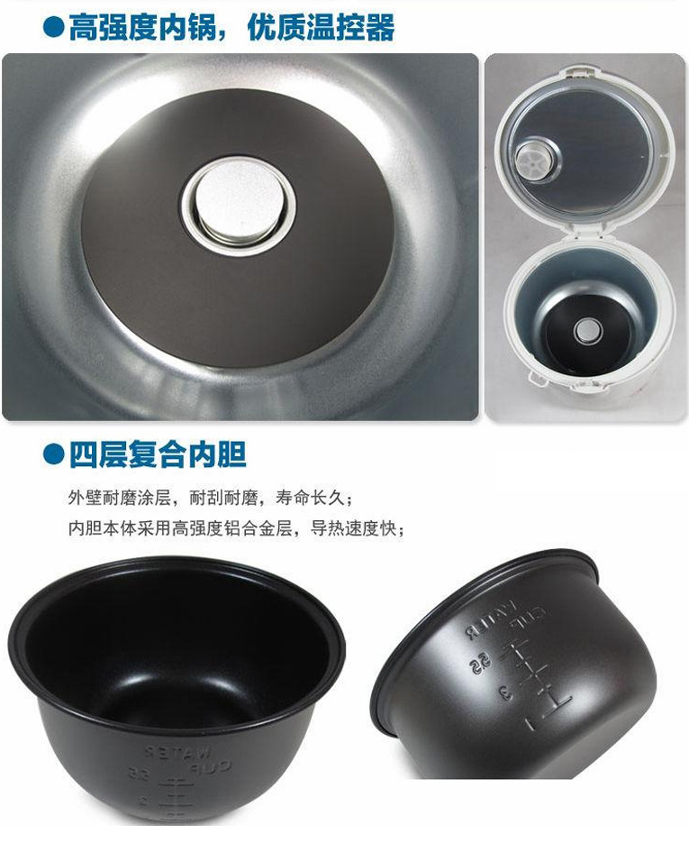 功能特性1、大蒸汽阀,微压回流系统,防溢保湿性能好,可拆卸清洗方便2、四层复合内胆,耐磨涂层,高强度铝合金层,粘合基质层,远红外不粘层3、远红外材料,加热均匀,米饭口感更好4、防凝露盖板,有效防止凝露浸饭;
