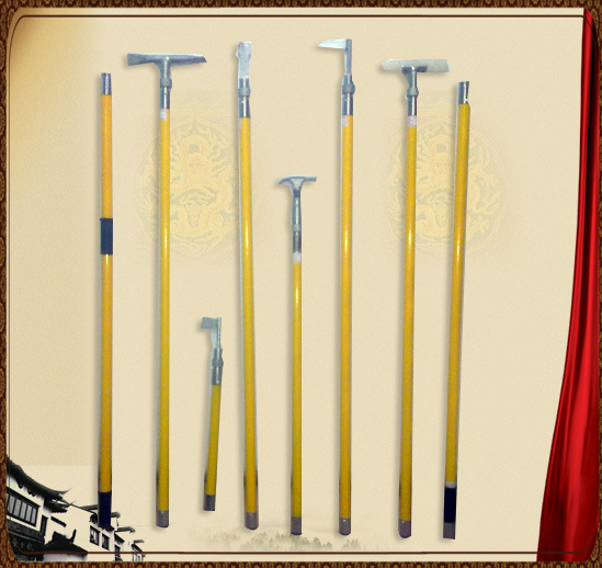 石家庄金能电力设备有限公司研制的国家专利产品---变电站人工除冰组合工具由除冰器具操作头及绝缘杆两部分组成,除冰器具操作头按照作用设计成不同形状,使用时可以通过敲、铲、钩等方式有效除去瓷瓶、支架、导线及杆塔上的积雪及覆冰。使用时,首先根据需要从套件中选取合适的除冰器具,将其安装到绝缘杆的一端并拧紧后即可使用。绝缘杆分为长、短两种规格,可以根据现场情况进行任意组合,以获取合适的长度来满足不同场合的需求。