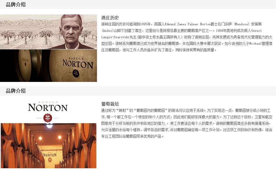 诺顿庄园的历史可追溯到1895年,英国人Edmund James Palmer Norton爵士在门多萨 (Mendoza) 安第斯 (Andes)山脚下创建了酒庄,这里如今是阿根廷最主要的葡萄酒产区之一