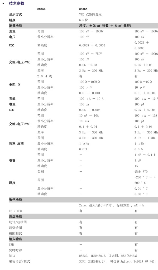 应用领域 8845A和8846A是两款全新的61/2位台式高精度万用表,秉承FLUKE公司一贯以来的高精度、多功能和紧凑耐用的特点,无论在台面单独使用还是在系统中集成,都能在简易的操控中发挥其功能全面、性能卓越的特色。 除了拥有同类产品中最高的24ppm的测试精度,可测量到10A的电流,高达1GΩ的电阻测试能力外,还可进行电容、温度、频率周期的测试,并且对测试数据进行统计分析和柱状图显示,如此多样性的组合功能在业界将会是无敌的。 功能特性 | | | 大屏幕双数据显示8845A/8846A具有独特的双显示屏,可以利用一组测试连接同时测量同一信号的两个不同参数。 | | 趋势绘图利用内置的TrendPlot 无纸记录仪以图形方式研读模拟电路中的种漂移和突发性事件。 | | | | 柱状图显示和统计分析以直方图模式观察结果,考察模拟电路中的稳定性或噪声问题。 | | 易于系统集成8845A/8846A可以模拟Fluke 45 和Agilent 34401A的操作和编程命令。使得8845A或8846A 能够非常容易地被集成到现有的测试系统中。 | | | | 多种接口给您最大的灵活性RS232,GPIB,LAN从多种接口中选择合适您使用的,或者使用8846A标配的USB接口,便可轻易存取数据和设置。 | | 两支探头即可实现四线测量的精度拥有专利的分隔式插孔,利用2 条测试线即可进行4 线测量。提供专用的方式来建立连接。用户可以获得卓越的分辨力和准确度,同时又具有仅一对测试线的便利性和易用性。 |