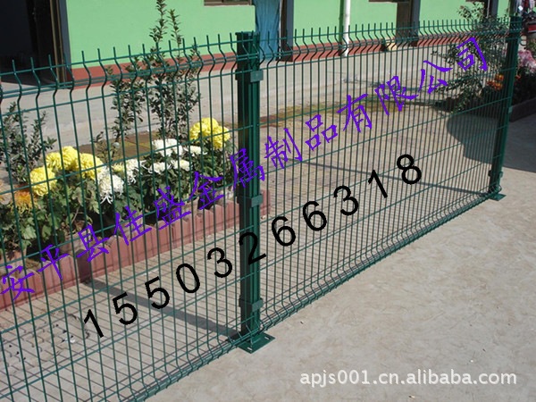 结构:用高强度冷拔丝与低碳钢丝焊接后经过液压成型,用链接附件与钢管支柱固定。 特点:强度高,钢性好,造型美观,视野宽广,安装简便,感觉明亮,轻松。 产品优点:合适的折弯,造就了此种产品独有的美观效果,而且表面采用多种 颜色的浸塑处理,如黄色,绿色,红色,立柱与网片不同颜色的搭配更是令人赏心悦目,同时此种产品多采用带底盘立柱,安装只需打好膨胀螺栓,非常的快捷。 适用场合:铁路封闭网、生活区围栏、场区围网、开发区隔离网等等。