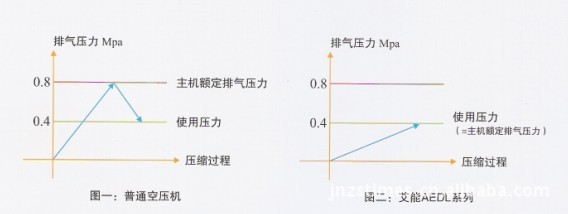 节能普通空压机应用于低压力时,是将空气压缩机高压力(0.8MPa)后才排出,此后,高压力的压缩机空气再膨胀减压至低压力(0.4MPa)