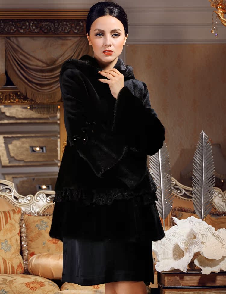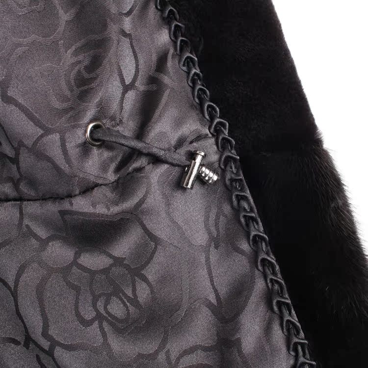 供应VOA维欧艾 限量1件黑色带帽中长款进口水貂裘皮大衣貂