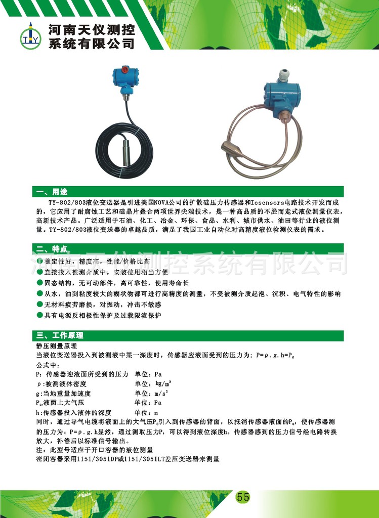 环保、食品、水利、城市供水、油田等行业的液位测量。TY-802、